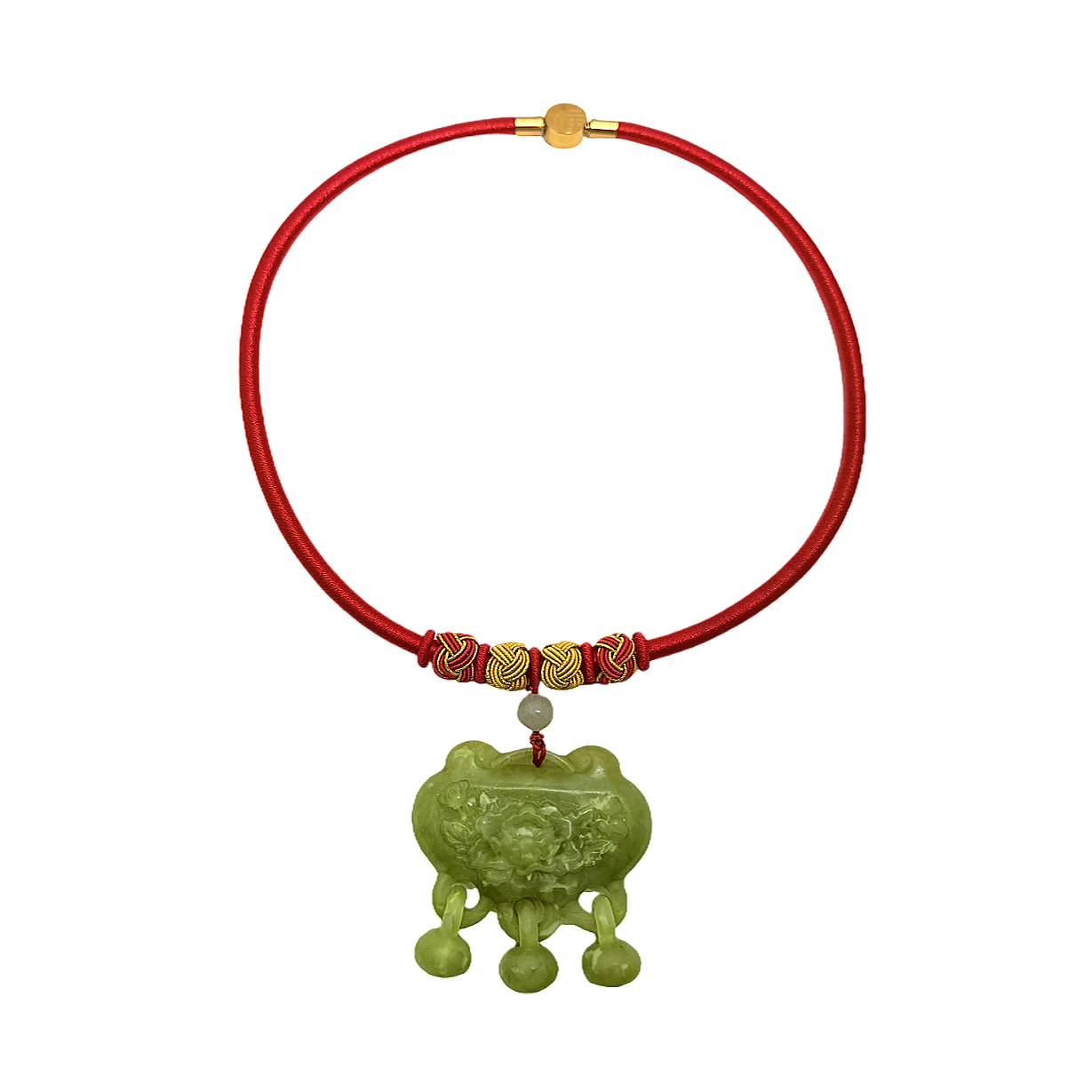This necklace features a vibrant red cord, a symbol of luck and protection in Chinese tradition, adorned with handwoven golden knots for added elegance. The centerpiece is a finely carved Hetian jade Ruyi pendant, representing good fortune, prosperity, and longevity.